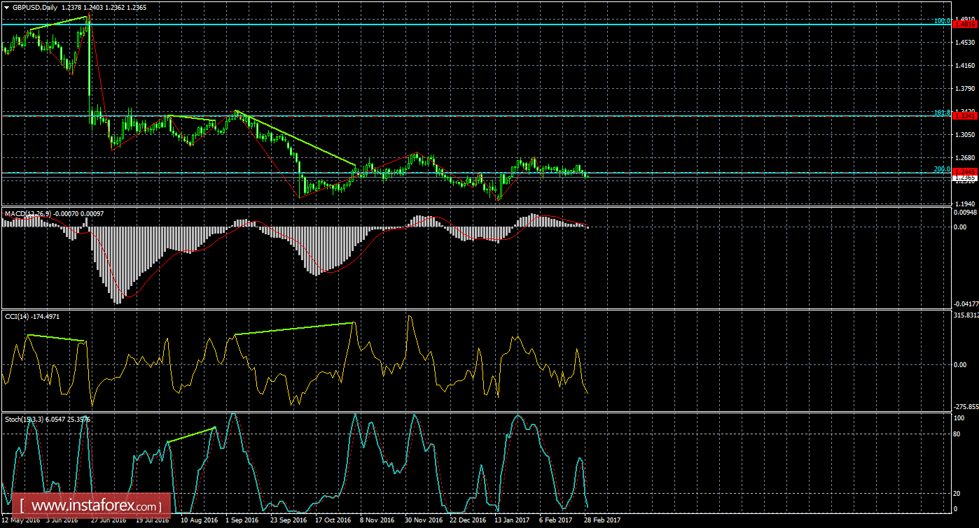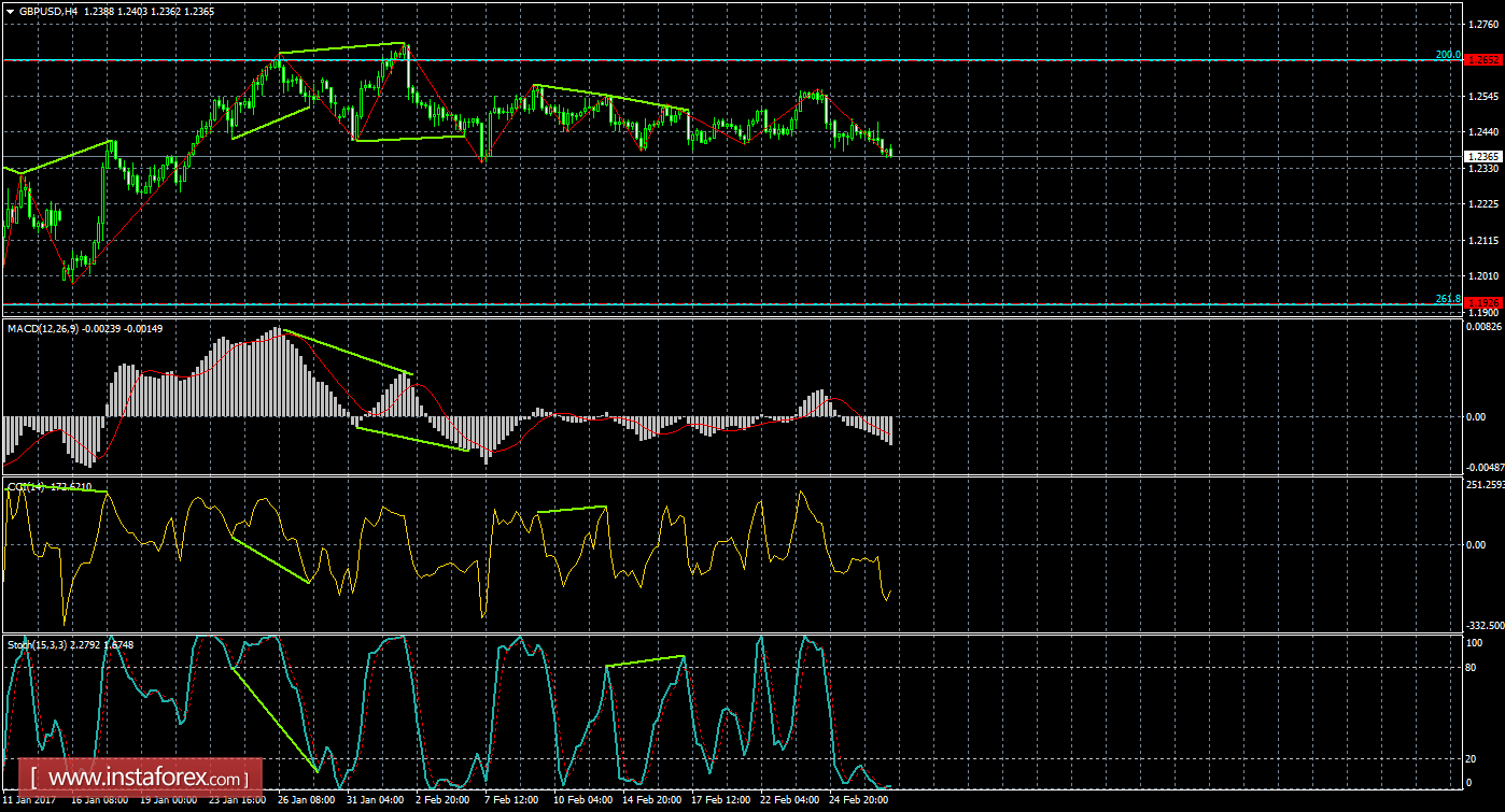 На 4-часовом графике пара выполнила разворот в пользу доллара США без отбоя от какого-либо уровня коррекции или образования медвежьей дивергенции и продолжает падение котировок в направлении коррекционного уровня 261,8% - 1,1926. Назревающих дивергенций 1 марта не видно ну и одного индикатора. Закрепление котировок над уровнем коррекции 200,0% 1,2652 позволит трейдерам рассчитывать на некоторый рост пары в направлении следующего уровня Фибо 161,8% - 1,3106.