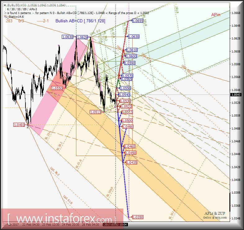 Развитие движения цены инструмента (EUR/USD) в период 02_03 марта 2017 г. будет обусловлено отработкой границ каналов 1/2 Median Line вил операционных масштабов -> SubMinuette (1.05134 <-> 1.0530 <-> 1.0550) и Micro (1.0540 <-> 1.0550 <-> 1.0565).