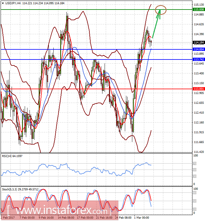 Пара USDJPY также сохраняет повышательную тенденцию, находясь выше уровня 114.00. Если выступление Йеллен будет позитивным для доллара, следует ожидать продолжения роста цены к 115.00.