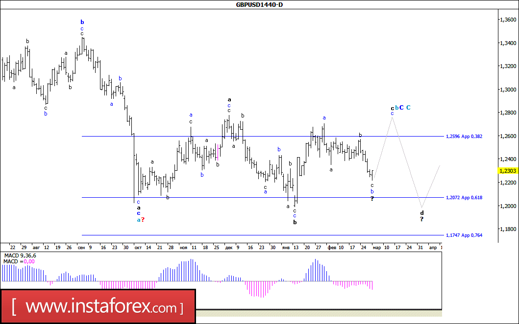 Фунт стерлингов находится в стадии построения понижательной волны С, в С. Понижение котировок может продолжиться с целями, расположенными около расчетных отметок 1,2072 и 1,1747, что соответствует 61,8% и 76,4% по Фибоначчи в рамках волны d, в b, в С, в С. В рамках повышательной волны (возможно с, в b, С, в С), инструмент может возобновить повышение с целями, расположенными около расчетных отметок 1,2596, что соответствует 38,2% по Фибоначчи, и выше около 27 фигуры.