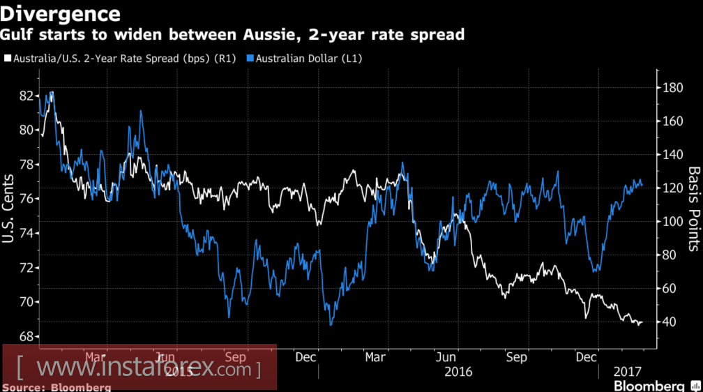 Вместе с тем монетарная политика RBA остается ультрамягкой, в то время как ФРС готова к повышению ставки по федеральным фондам. Фьючерсы CME оценивают вероятность ужесточения денежно-кредитной политики в марте в 80%, а шансы трех актов монетарной рестрикции в 2017 – в 54%. На этом фоне сужение дифференциала доходности по двухлетним австралийским и американским свопам до 34 б.п, минимальной отметки с мая 2001, играет на руку доллару США.