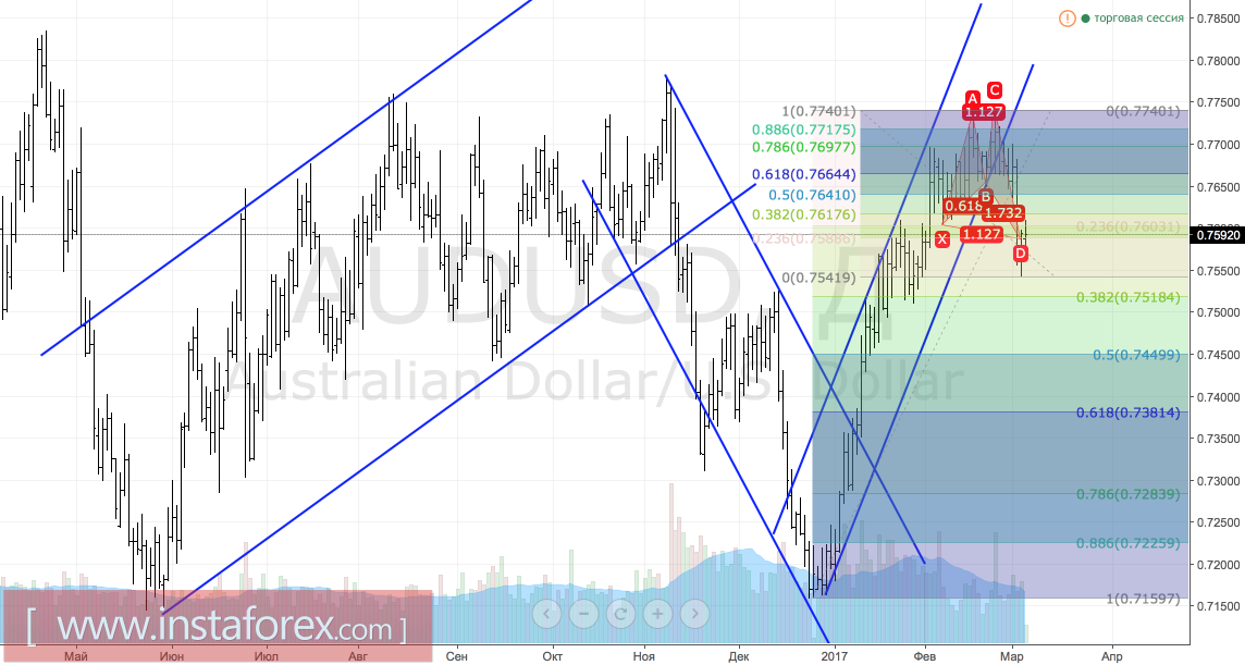Ключевыми событиями недели для анализируемой пары станут заседание Резервного банка, релиз данных по торговому балансу Китая и выход в счет статистики по рынку труда США. Трейдерам следует сделать акцент на продажи AUD/USD на росте в направлении 38,2% и 50% волны CD паттерна 5-0.