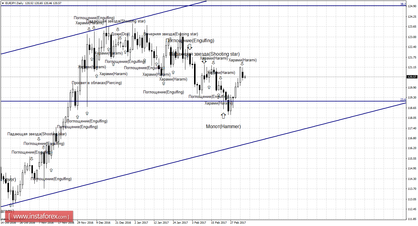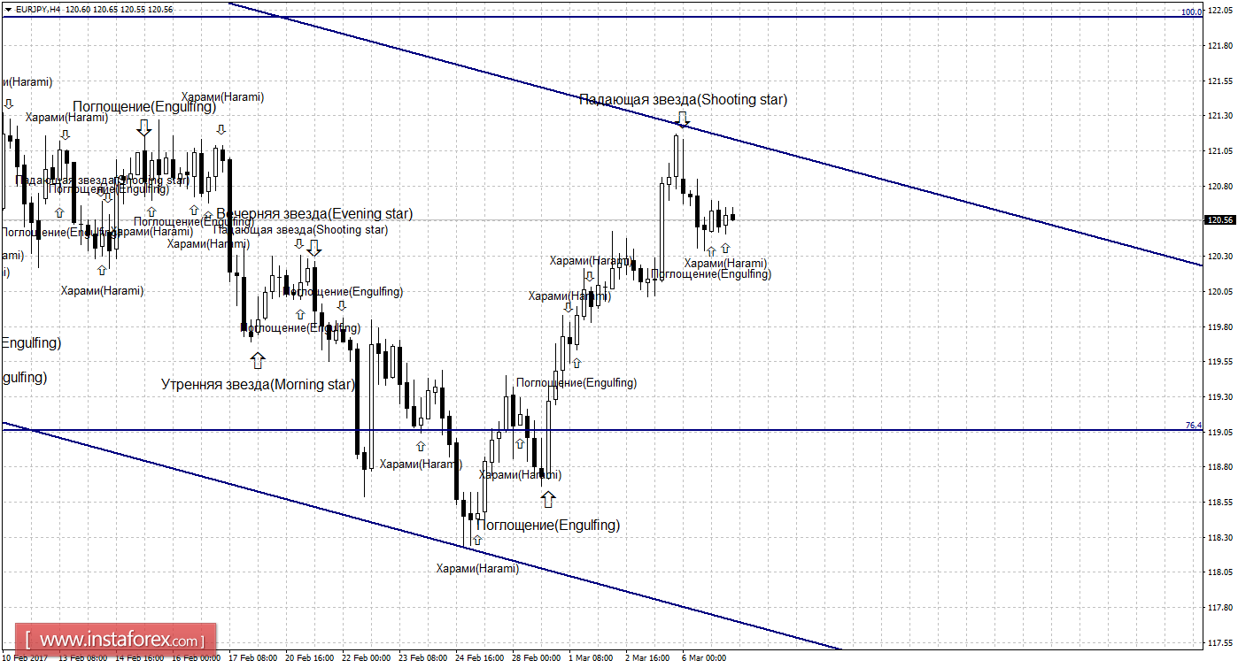 Сразу две несильные бычьи формации - «Поглощение» и «Харами» - остановили процесс падения на 4-часовом графике. Пара выполнила разворот в пользу валюты ЕС и начала слабый рост в направлении коррекционного уровня 100,0% - 122,01. Образование 7 марта медвежьей свечной формации позволит трейдерам ожидать разворот в пользу валюты Японии и возобновление падения котировок в направлении уровня коррекции 76,4% - 119,06. Такая формация будет являться трендовой, исходя из направления равноудаленного канала.