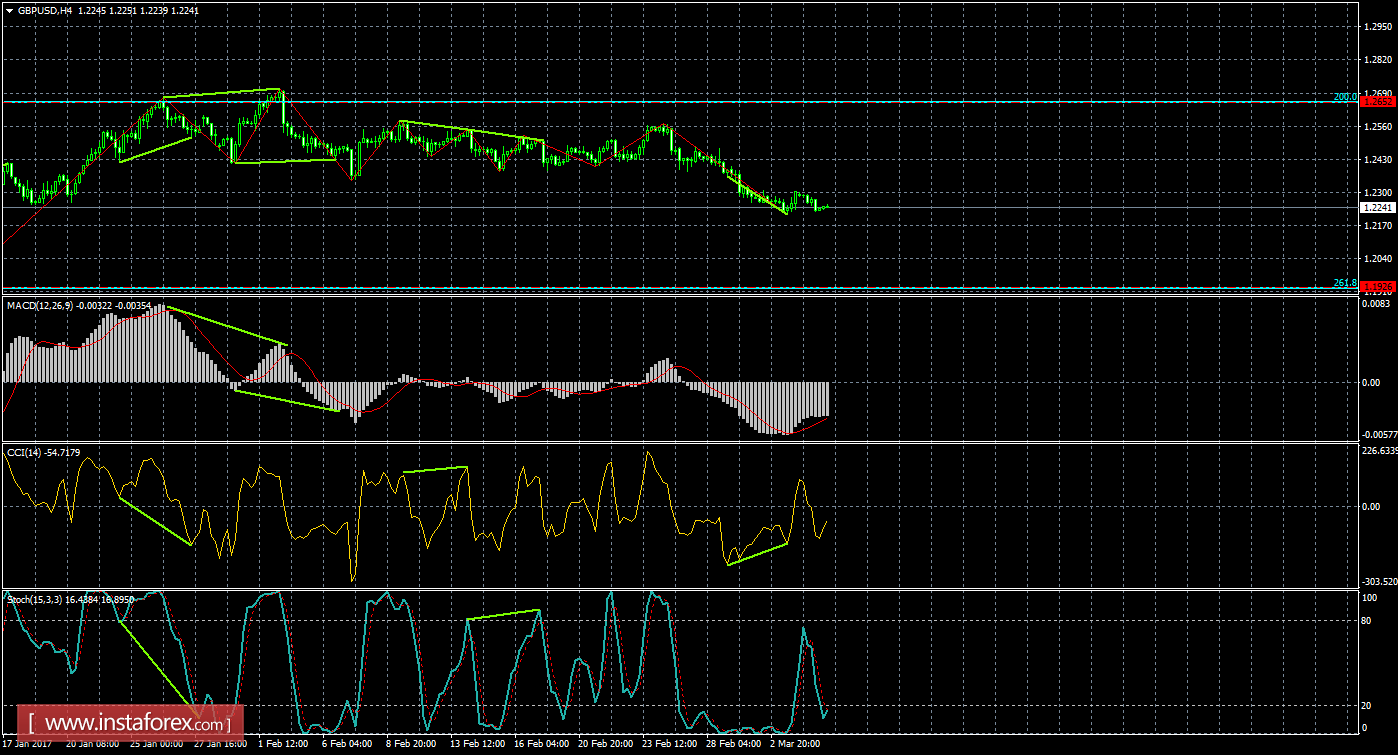 На 4-часовом графике пара выполнила разворот в пользу валюты Англии и начала рост в направлении уровня Фибо 200,0% - 1,2652 после образования бычьей дивергенции. Бычья дивергенция у индикатора CCI: последний лоу котировок получился ниже предыдущего, а аналогичный лоу индикатора - выше предыдущего. Проход 7 марта последнего дивергенционного лоу сработает в пользу доллара США и возобновления падения в направлении уровня коррекции 261,8% - 1,1926, а также отменит дивергенцию. Новых назревающих дивергенций сейчас не наблюдается.