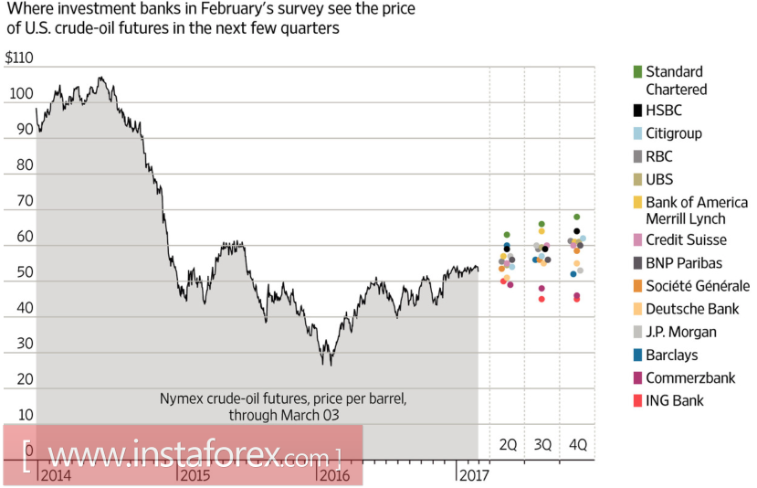 В целом конъюнктура рынка черного золота не меняется уже которую неделю: пока ОПЕК сокращает добычу, американские производители этим пользуются. Число буровых установок от Baker Hughes продолжает расти на протяжении полугода, достигнув отметки 609 и увеличивая риски превышения прогноза Министерства энергетической информации США по добыче на 2017 (9 млн б/с). «Быки» по Brent и WTI упорно игнорируют негатив, продолжая держаться за лонги. Сокращение спекулятивных нетто-длинных позиций на неделе к 28 февраля на 6,5% выглядит обычной технической коррекцией, при этом аналитики брокерской компании PVM отмечают, что инвесторы не готовы отказаться от своих оптимистичных взглядов. После снижения цен на рубеже зимы и весны «быкам» удалось дважды встать на ноги с колен, так что их уверенность в светлом будущем нефти лишь усилилась.
