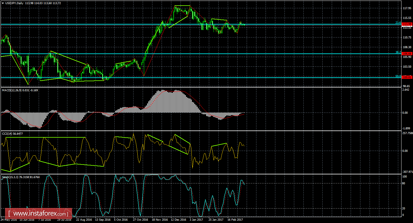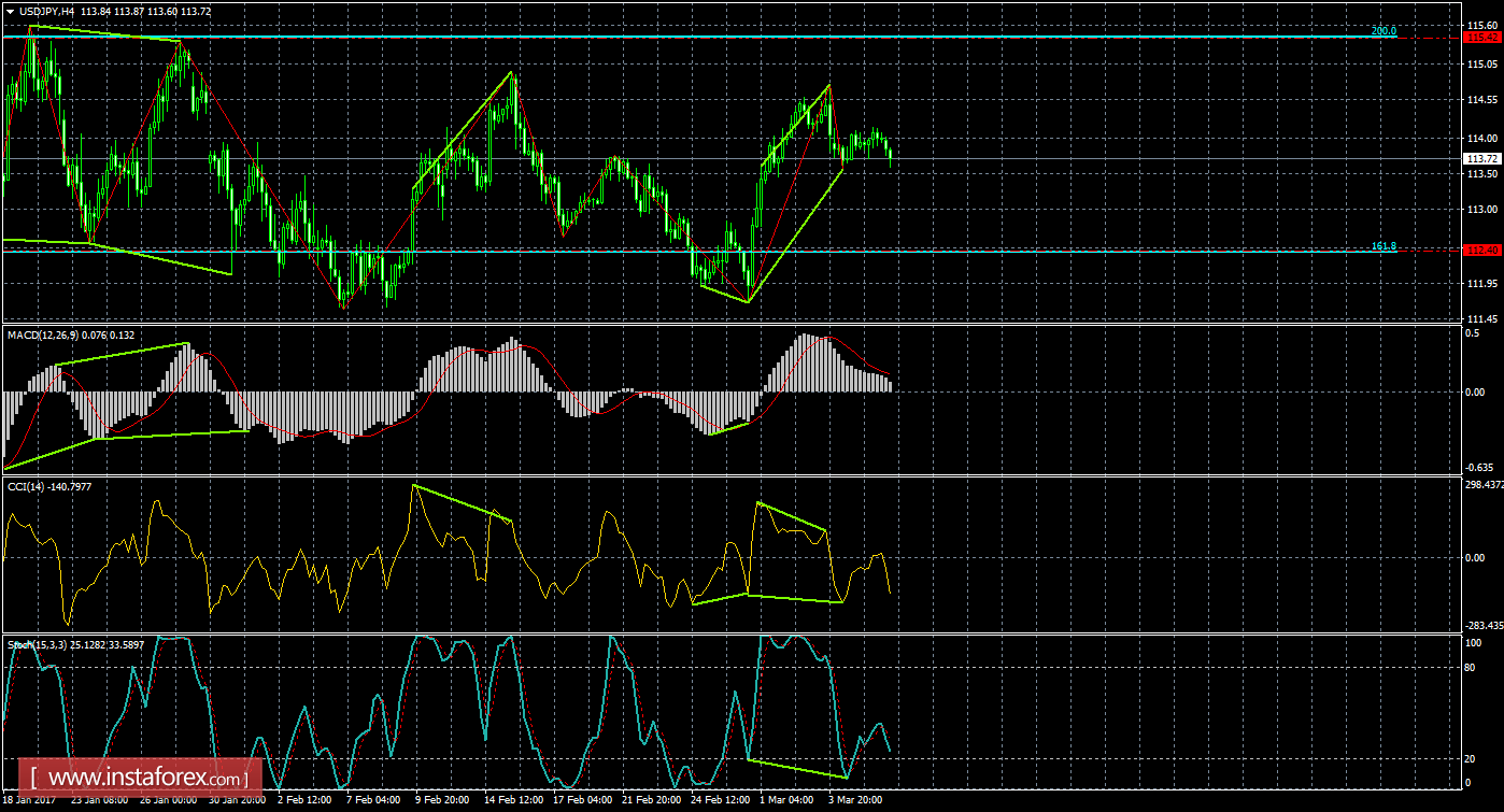 Бычья дивергенция, образовавшаяся на 4-часовом графике, позволила паре выполнить некоторый рост, но сейчас, похоже, пара выполнила разворот уже в пользу валюты Японии и начала падение в направлении уровня Фибо 161,8% - 112,40. Бычья дивергенция у индикатора CCI: последний лоу котировок получился выше предыдущего, а аналогичный лоу индикатора – ниже. Проход парой последнего дивергенционного лоу повысит шансы на дальнейшее падение котировок. Новых назревающих дивергенция сейчас не наблюдается ни у одного индикатора.