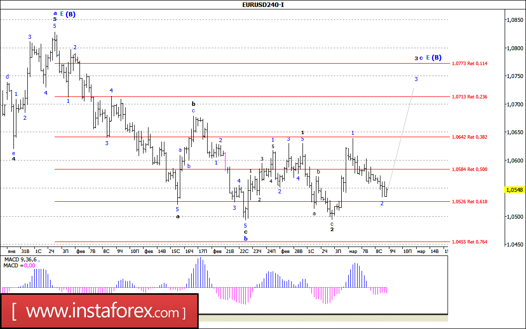 Начав вчерашние торги с нисходящего движения, во второй половине дня, на волне общего укрепления доллара, пара EUR/USD смогла отработать отметку 1,0535. При этом валютная пара по-прежнему оставалась в стадии формирования 2-й волны, в будущей 3-й, в с, в Е, в (В). Если это так, то от уже достигнутого минимума валютная пара может возобновить рост котировок и тем самым обозначить начало 3-й волны, в 3-й, в с, в Е, в (В).
