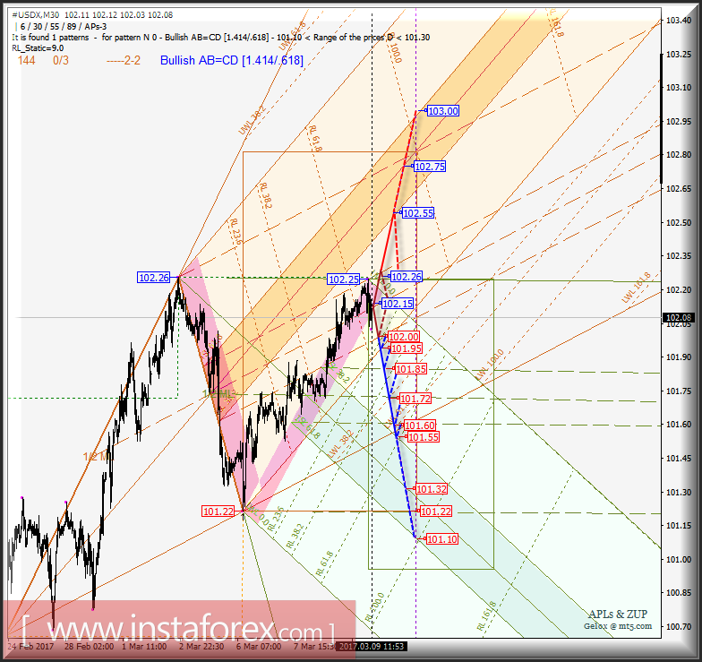 Развитие движения индекса доллара (#USDX) в период 09_10 марта 2017 г. будет обусловлено отработкой границ канала 1/2 Median Line (102.00 <-> 102.15 <-> 102.26) вил операционного масштаба SubMinuette.
