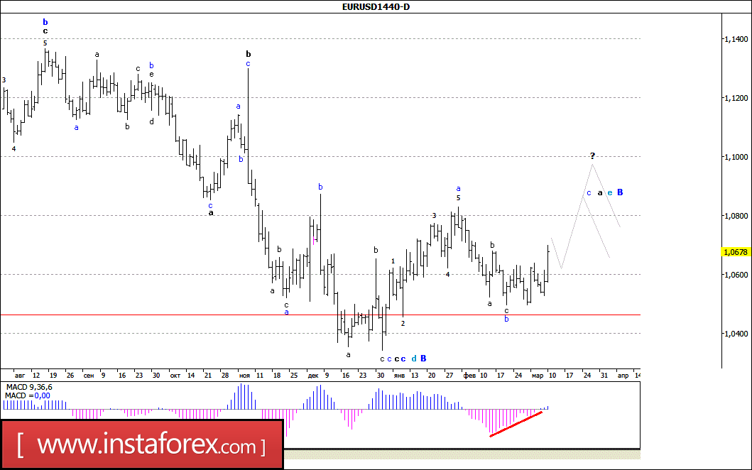 После снижения цены к отметке 1,0525, пара EUR/USD смогла возобновить восходящее движение и завершила последний день минувшей недели на подходе к уровню 07-й фигуры. Таким образом, можно предположить, что валютная пара подтвердила переход в стадию формирования первых образующих волн, в составе будущей волны с, в а, в е, в В. Если это так, то у валютной пары появился потенциал, позволяющий ей продолжить рост котировок в направлении расчетных целей для этой волны с, в а, в е, в В, расположенных в диапазоне от отметки 1,0850 и далее к уровню 1,1000.