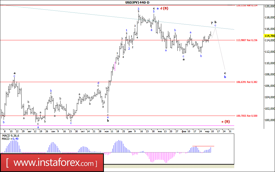 Пара USD/JPY продолжает построение волны (B). На этой неделе может возобновиться понижение котировок (в рамках с, в b, в d, в (B)) с целями, расположенными около расчетных отметок 109,69 и 106,63, что приравнивается к 100,0% и 38,2% по Фибоначчи. В рамках повышательной коррекционной волны (в составе с, в d, в (B)) инструмент продолжает сейчас повышение с целями, расположенными между 114 и 116 фигурами. Возможно, также сейчас начала свое построение уже волна e, в (B).