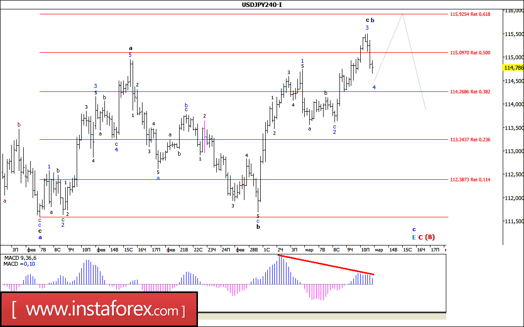 Начав пятничные торги с восходящего движения, пара USD/JPY не смогла закрепиться над уровнем 115-й фигуры и до конца дня цена откатилась к отметке 114,70. Складывающаяся при этом волновая ситуация позволяет предполагать, что валютная пара оставалась в стадии формирования волны с, в этой b, в Е, в С, в (В), завершив ее внутреннюю 3-ю волну. Если это так, то несмотря на обозначившуюся дивергенцию MACD_ака, валютная пара сохраняет потенциал, позволяющий ей возобновить рост котировок и протестировать уровень 116,00.
