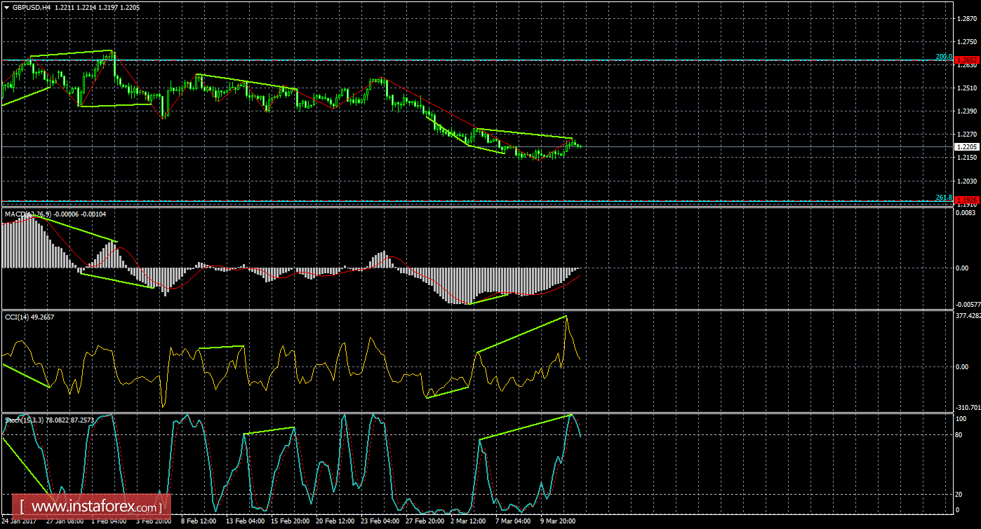 На 4-часовом графике пара выполнила небольшой рост и образовалась медвежья дивергенция, которая позволяет паре выполнить теперь разворот в пользу американской валюты и начать процесс падения в направлении уровня коррекции 261,8% - 1,1926. Медвежья дивергенция у индикаторов CCI и Stochastic: последний пик котировок получился ниже предыдущего, а аналогичные пики индикаторов - выше предыдущих. Проход парой 14 марта последнего дивергенционного пика отменит дивергенцию, а рост котировок может продолжиться в направлении коррекционного уровня 200,0% - 1,2652.