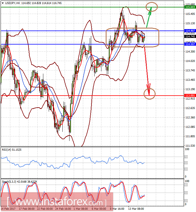 Пара USDJPY также торгуется в узком диапазоне 114.50-114.90 в ожидании новостей от американского ЦБ. Позитивные для доллара вести приведут к прорыву верхней границы диапазона и росту цены к 115.60. Но если ожидания инвесторов не оправдаются, то после преодоления нижней границы диапазона пара может устремиться к 113.00.