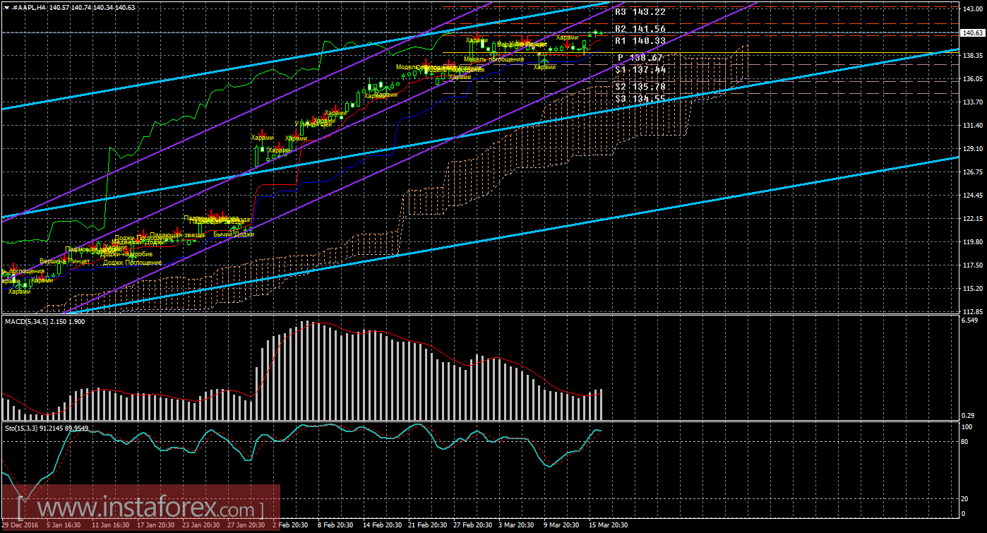 Анализируя акции компании Apple 17 марта, видим, что цена продолжает слабейшее восходящее движение и закрепилась выше первого таргета 140,33. Текущий «золотой крест» остается сильным (так как цена располагается выше облака), поэтому лонги индикатор Ишимоку разрешает рассматривать. Оба канала линейной регрессии направлены вверх, поэтому лонги актуальны и по этому признаку. Целью для восходящего движения инструмента является уровень сопротивления 141,56. Следующей целью для движения вверх выступает 143,22. Новых свечных моделей на данный момент нет. MACD направлен вверх, сигнализируя о восходящем движении, разворот индикатора вниз укажет на виток нисходящей коррекции. Стохастик вернулся в область перекупленности, что сейчас свидетельствует о восходящем настроении участников рынка. Отскок цены от уровня 141,56 может спровоцировать коррекционное движение. Младший таймфрейм детализирует картину старшего таймфрейма. На младшем графике видно, что цена может продолжить движение вверх, так как преодолела уровень 140,33. Ордера на покупку, таким образом, сейчас актуальны с целью уровень сопротивления 141,56. Если цена закроется ниже 140,33, это может засвидетельствовать виток локальной нисходящей коррекции. Разворот индикатора MACD вверх может указать на завершение текущей боковой коррекции.