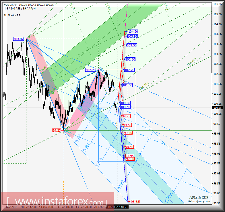 Развитие движения индекса доллара (#USDX) в период 20 марта - 03 апреля 2017 г. будет обусловлено отработкой контрольной линии LTL (уровень сопротивления 100.60) вил операционного масштаба Minute и верхней границы канала 1/2 Median Line(уровень поддержки 100.40) вил операционного масштаба Minuette.