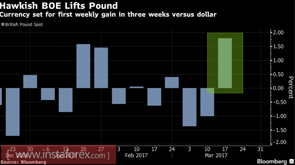 Британский фунт отметился лучшим недельным результатом по отношению к доллару США, по меньшей мере с начала года после того, как Кристин Форбс проголосовала за повышение ставки РЕПО с 0,25% до 0,5% на мартовском заседании Комитета по монетарной политике BoE. Это стало полной неожиданностью для «медведей» по стерлингу и вынудило их в спешке закрывать короткие позиции на фоне роста вероятности ужесточения денежно-кредитной политики Банка Англии к сентябрю 2018 с 60% до 95%. Намеки на монетарную рестрикцию на фоне замедления экономики Туманного Альбиона кажутся очень странными, однако у каждого действия Центробанка, безусловно, имеется своя цель.