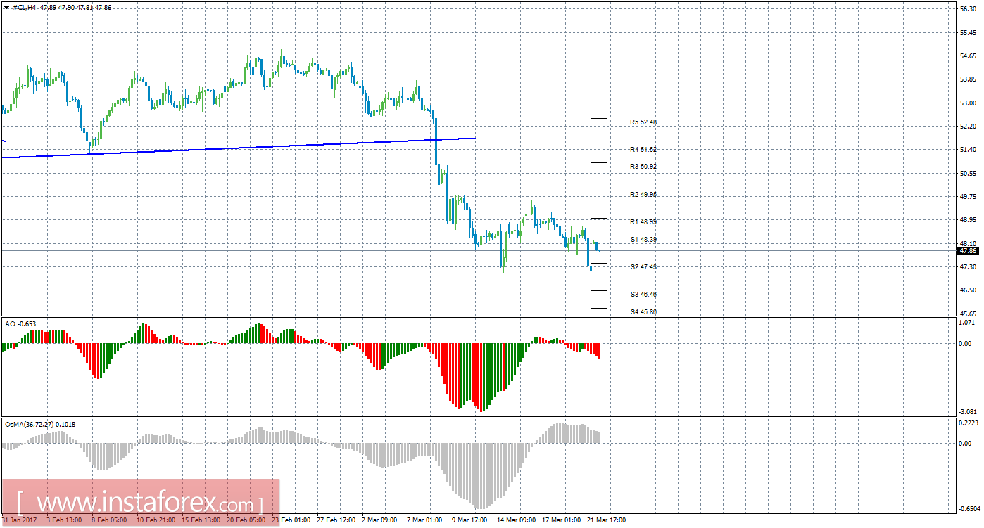 Анализ сырой нефти за 22 марта показывает, что цена в целом продолжает движение вниз, располагаясь ниже уровня S1. Целями для продолжения нисходящего движения сейчас являются уровни поддержки S2 – 47,43 и S3 – 46,46, если цена останется ниже 48,39. Целями для восходящей коррекции выступают уровни 48,99 и 49,95, если цена преодолеет 48,39. Восходящая линия более не актуальна, так как цена закрепилась ниже нее. Тенденция на рынке изменилась на нисходящую, и теперь являются актуальными ордера на продажу. Нисходящей линии тренда по-прежнему нет. Индикатор Awesome показывает текущее нисходящее движение, так как последний закрытый бар красного цвета. OsMA также направлен вниз, что говорит о нисходящем характере движения и в среднесрочном плане. Отскок цены от уровня 47,43 может спровоцировать виток коррекции.