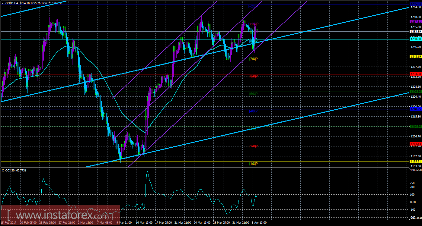 Техническая картина золота 6 апреля показывает, что цена ненадолго закрепилась ниже мувинга, но вернулась выше этой линии и еще раз отработала уровень Мюррея «+1/8». Старший канал направлен вверх, что свидетельствует о восходящем направлении движения глобального тренда. Младший канал также направлен вверх, что означает восходящее направление движения и в среднесрочном плане. Сейчас цена находится выше мувинга и выше уровня Мюррея «8/8», что указывает на восходящее направление движения в ближайшие дни. Первой целью для движения вверх, таким образом, является уровень Мюррея «+1/8» - 1257,81, который уже был достигнут 2 раза. Если первый таргет будет преодолен, то новой целью будет выступать уровень Мюррея «+2/8» - 1265,63. Мувинг направлен вверх, а цена располагается выше него, поэтому сейчас более вероятно восходящее движение. Хайкен Аши окрасил последние бары в фиолетовый цвет, что указывает на текущее восходящее движение. Разворот индикатора вниз просигнализирует о начале новой коррекции, а длинные позиции станут на время не актуальными. Ордера на продажу можно будет рассматривать только после закрепления ниже мувинга и разворота вниз любого канала. Индикатор CCI находится около уровня 100, что сигнализирует о наличии слабой перекупленности инструмента.