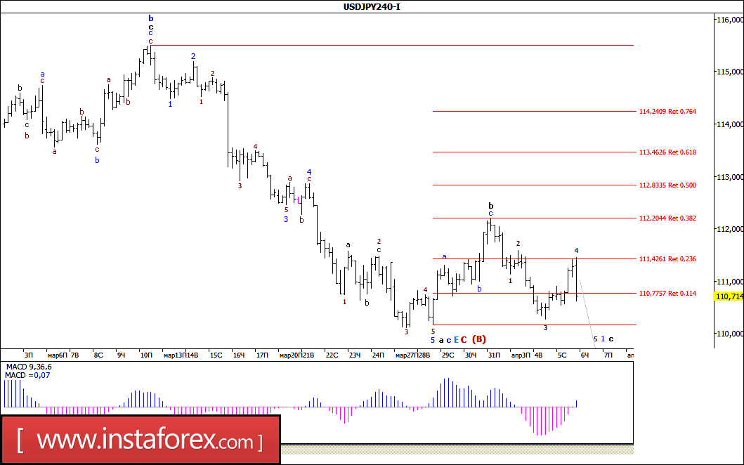 Только после роста к отметке 111,45, пара USD/JPY смогла возобновить нисходящее движение и к завершению торгов возвратилась в район уровней открытия дня. Таким образом, похоже на то, что валютная пара по-прежнему оставалась в стадии формирования будущей волны с, в с, в Е, в С, в (В), в которой ее внутренняя 1-я волна начала принимать вид пятиволновой структуры. Если это так, то уже обозначившееся снижение котировок может получить дальнейшее развитие в направлении уровня 109-й, или даже 108-й фигуры.