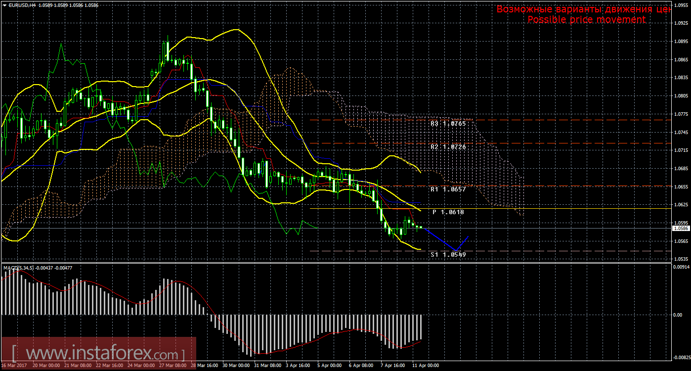 Анализ рынка Форекс по паре евро/доллар за 11 апреля показывает, что цена начала слабую восходящую коррекцию с целью линия Киджун-сен. Текущий сигнал на продажу остается подтвержденным и сильным, так как Чинкоу Спан находится ниже графика цены, а цена по-прежнему располагается ниже облака Ишимоку. На данный момент целью для нисходящего движения является уровень поддержки 1,0549. В случае преодоления этой цели, новым таргетом будет выступать второй уровень поддержки 1,0510. Нисходящее движение будет актуальным до тех пор, пока цена находится ниже линии Киджун-сен (1,0630). Если цена закрепится выше критической линии, то «мертвый крест» будет ослаблен, нисходящее движение будет отменено, движение вверх сможет продолжиться с целью нижняя граница облака Ишимоку, а короткие позиции на время потеряют свою актуальность. Боллинджер Бандс показывает продолжение нисходящего движения, полосы расширяются и направлены вниз, поэтому сейчас на рынке рекомендуется рассматривать варианты ордеров на продажу. MACD развернулся наверх, что свидетельствует о текущем коррекционном движении. Разворот индикатора обратно вниз просигнализирует о завершении коррекции. Отскок цены от линии Киджун-сен может спровоцировать возобновление движения вниз.