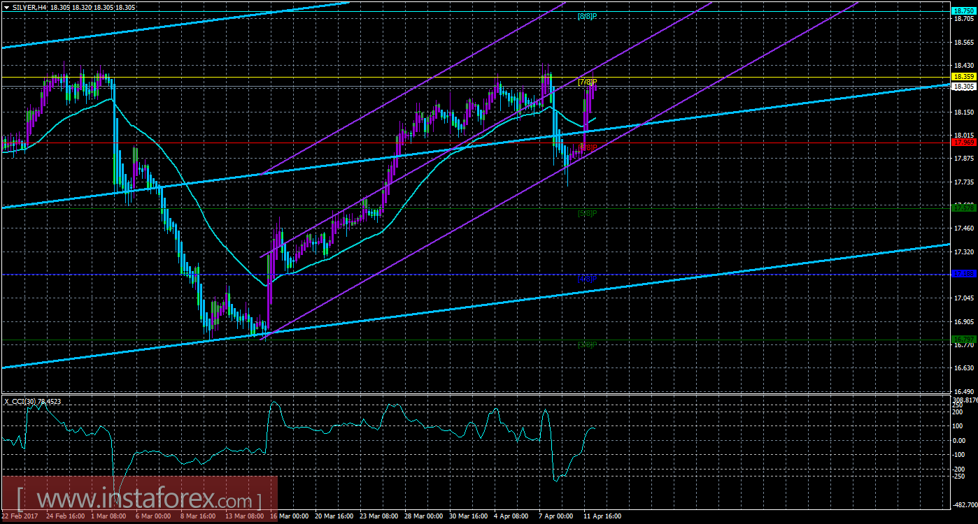 Из анализа серебра 12 апреля следует, что цена закрепилась выше мувинга и вновь отработала уровень Мюррея «7/8». Старший канал направлен вверх, что свидетельствует о восходящем направлении движения глобального тренда. Младший канал также направлен вверх, что означает восходящее движение и в менее долгосрочном плане. В данный момент цена находится выше мувинга и выше уровня Мюррея «6/8», что делает более вероятным продолжение восходящего движения. Первой целью для движения вверх сейчас является уровень Мюррея «7/8» - 18,359, который уже достигнут еще раз. Если цена преодолеет этот уровень, то новой целью будет выступать уровень Мюррея «8/8» - 18,750. Скользящая средняя направлена вверх, а цена располагается выше нее, что сигнализирует о текущем восходящем направлении движения. Ордера на продажу станут актуальными не раньше закрепления ниже мувинга и разворота вниз хотя бы одного канала. Хайкен Аши окрасил последние бары в фиолетовый цвет, что сигнализирует о внутридневном движении вверх, таким образом, открытые длинные позиции сейчас можно сопровождать. Окрас 1-2 баров в голубой цвет укажет на начало коррекции. Индикатор CCI находится около уровня 100, что сигнализирует о наличии слабой перекупленности инструмента.