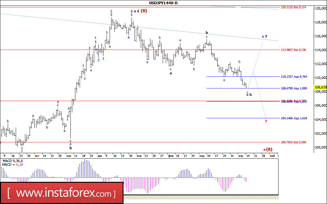 Торги минувшей недели пара USD/JPY начала с ожидаемого нисходящего движения и, потеряв около 300 б.п, в конце пятничной сессии смогла отработать отметку 108,55. Таким образом, можно предположить, что в результате такого снижения валютная пара обозначила начало будущей волны с, в с, в b, в d, в (В) (или с, в е, в (В)). Если это так, то сохраняя потенциал для разворота и возврата цены в район максимумов начала года, валютная пара может продолжить падение котировок вплоть до уровня 104-й фигуры, что, в свою очередь, подтвердит ее переход в стадию формирования волны с, в е, в (В).