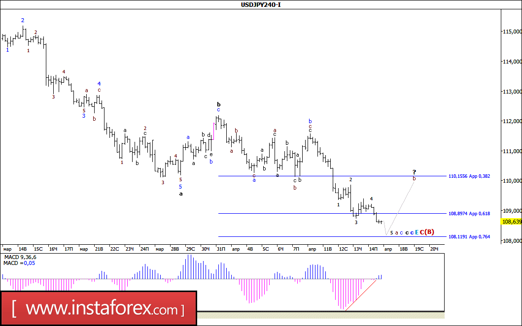 Инструмент продолжает построение волны E, в С, в (B). В рамках построения коррекционной волны в составе с, в с, в E, в С, в (B), повышение котировок может начаться с целями, находящимися около расчетной отметки 110,15, что соответствует 38,2% по Фибоначчи. В рамках волны с, в с, в E, в С, в (B) понижение котировок продолжается с целями, расположенными около отметки 108,11, что приравнивается к 76,4% по Фибоначчи, и ниже около 107 фигуры.