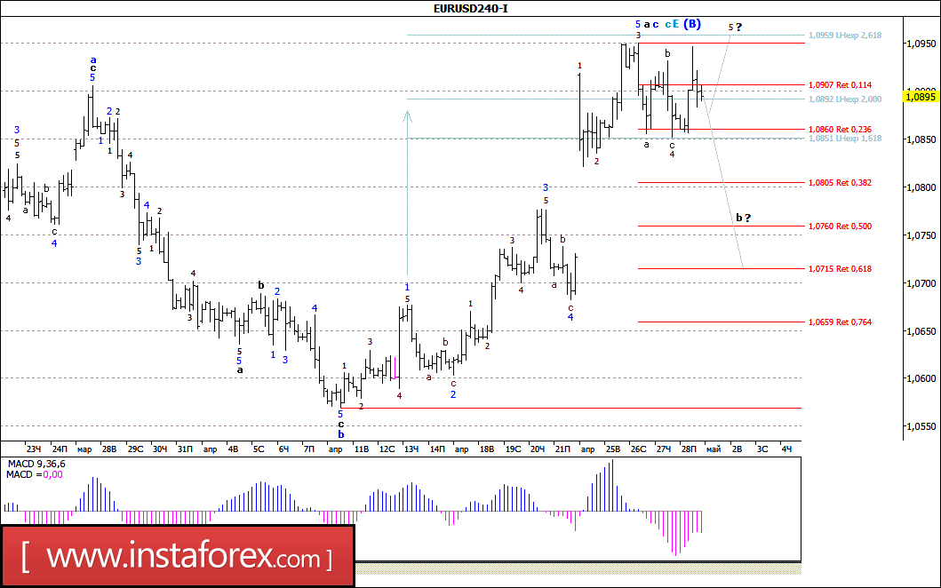 Публикация в пятницу статистических данных, отразивших рост потребительской инфляции в еврозоне за апрель, вызвала заметное укрепление евро, а также всплеск волатильности торгов по паре EUR/USD. При этом можно предположить, что в результате возврата цены практически к уровню 1,0950 валютная пара уточнила внутреннюю волновую структуру 5-й волны, в а, в с, в с, в Е, в (В). Если это так, то от достигнутого в последний день минувшей недели максимума, или после отработки расчетной цели в районе отметки 1,0960, валютная пара все же возобновит снижение котировок, перейдя в стадию формирования волны b, в с, в с, в Е, в (В).