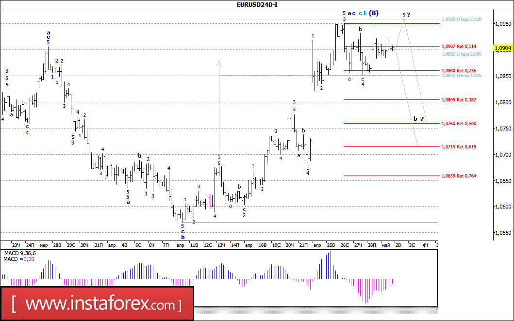 Первомайский выходной на большинстве мировых торговых площадок не позволил вчера паре EUR/USD определиться с направлением движения, в связи с чем весь минувший день она провела в диапазоне, торгуясь вокруг уровня 09-й фигуры. При этом похоже на то, что валютная пара оставалась в стадии формирования близящейся к своему завершению 5-й волны, в а, в с, в с, в Е, в (В). Если это так, то прежде чем обозначить начало будущей волны b, в с, в с, в Е, в (В) валютная пара может отработать расчетную цель, соответствующую отметке 1,0960.
