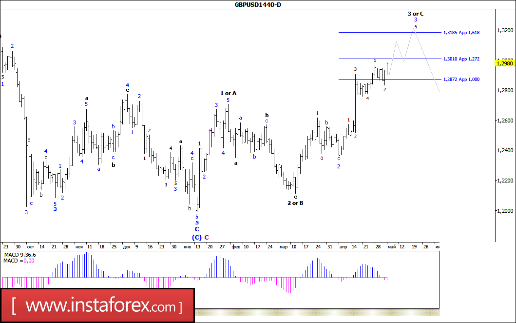 После снижения к отметке 1,2830, только в четверг пара GBP/USD смогла возобновить ожидаемое восходящее движение и, обновив достигнутый в конце апреля максимум, остановилась в пятницу у отметки 1,2985. При этом можно предположить, что валютная пара несколько усложнила внутреннюю волновую структуру 3-й волны, в 3-й (или С в составе восходящего участка тренда, получившего развитие от минимума 16 января. Если это так, то в процессе развития 5-й волны, в 3-й, в 3-й (или С) валютная пара, скорее всего, продолжит рост котировок к уровню 32-й фигуры.