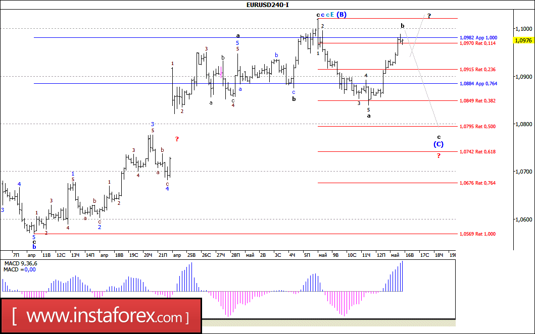 В начале вчерашней европейской сессии пара EUR/USD продолжила развитие начавшегося в пятницу восходящего движения и, прибавив в цене более 60 п.п., во второй половине дня достигла отметки 1,0990. При этом можно предположить, что валютная пара оставалась в стадии формирования волны b, в будущей (С), которая к закрытию американской сессии приобрела вполне завершенный, хотя и сильно удлиненный, вид. Если это так, то от максимума минувшего дня валютная пара возобновит снижение котировок, обозначив тем самым начало будущей волны с, в (С).