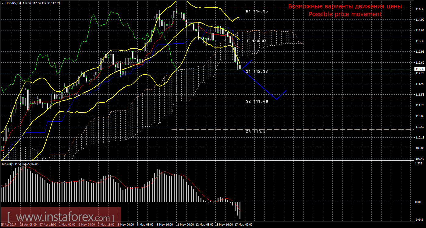 Анализ пары доллар/иена на рынке Форекс 17 мая показывает, что цена продолжает отрабатывать новый сигнал на продажу и отработала первый таргет. Текущий «мертвый крест» является подтвержденным и сильным, так как Чинкоу Спан находится ниже графика цены, а цена располагается ниже облака Ишимоку. Поэтому сейчас целью для движения вниз является уровень поддержки 112,38, который уже достигнут. Если этот таргет будет преодолен, то новой целью будет выступать уровень поддержки 111,40. Нисходящее движение будет актуально до тех пор, пока цена находится ниже критической линии Киджун-сен (113,30). Если цена закрепится выше Киджун-сен, текущий «мертвый крест» будет поставлен на грань отмены, движение вниз – будет отменено, восходящее движение сможет продолжиться с целью уровень сопротивления 114,35, а шорты потеряют свою актуальность. Боллинджер Бандс показывает продолжение нисходящего движения, полосы расширяются и направлены вниз, поэтому сейчас на рынке рекомендуется рассматривать варианты ордеров на продажу. MACD развернулся вниз, сигнализируя о текущем нисходящем движении. Если индикатор сменит направление на восходящее, это укажет на начало коррекции. Отскок цены от уровня 112,38 также может спровоцировать коррекционное движение.
