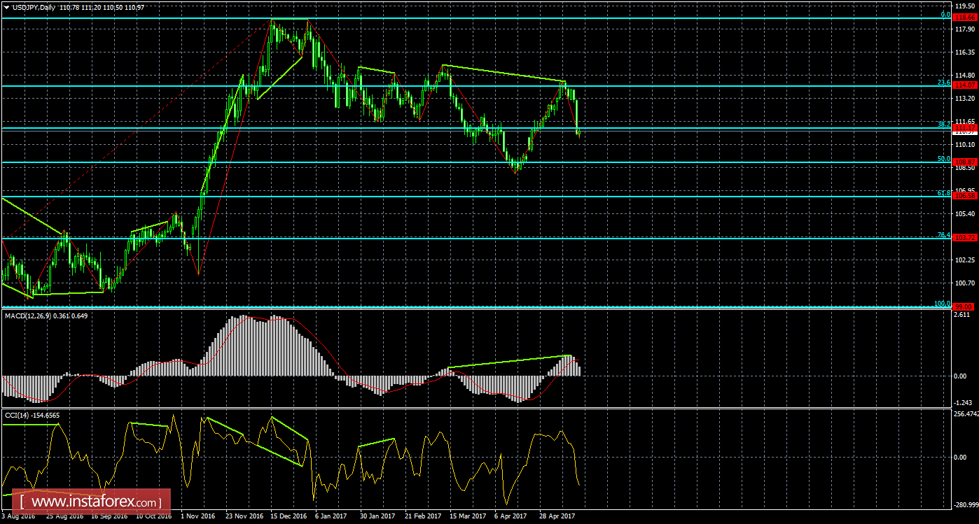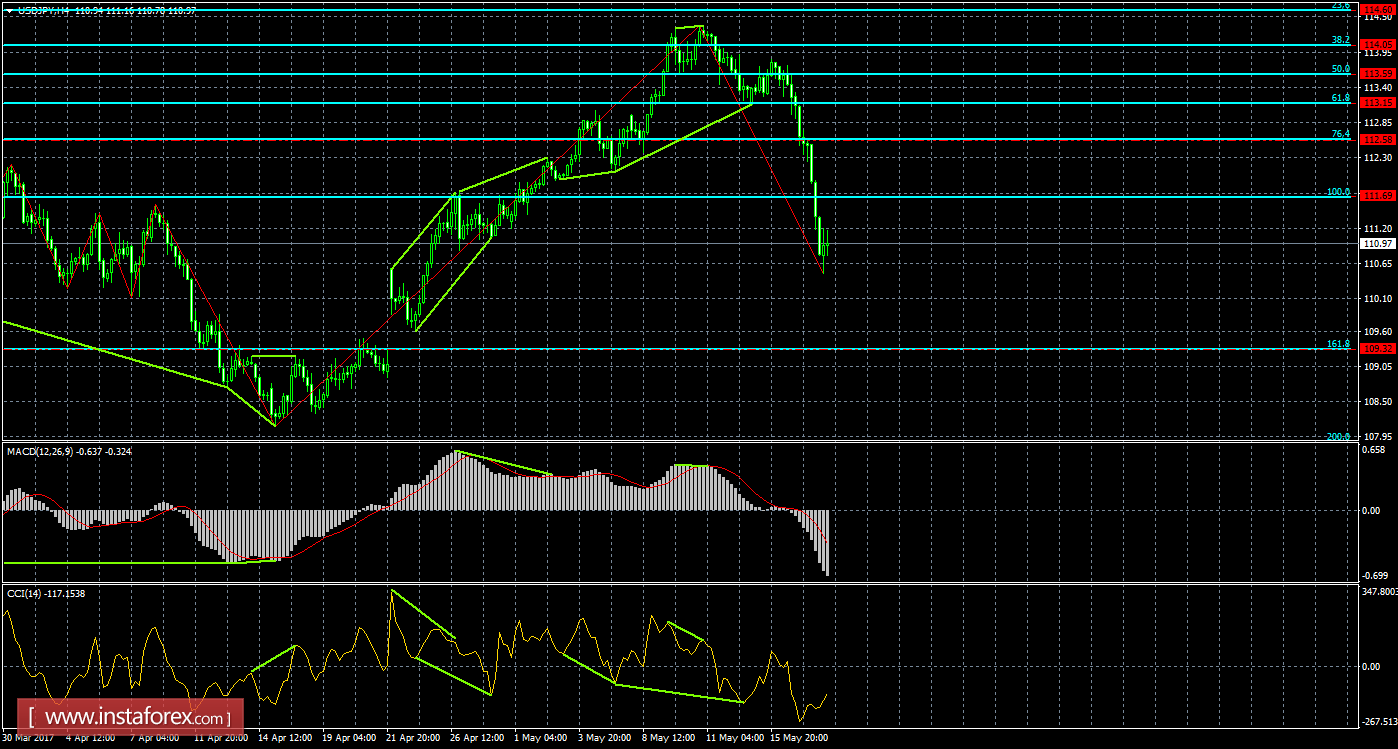 Падение котировок USD/JPY продолжается на 4-часовом графике, а пара выполнила закрепление под уровнем коррекции 100,0% - 111,69. В итоге падение курса может быть продолжено 18 мая в направлении следующего уровня Фибо 161,8% - 109,32. Назревающих дивергенций не наблюдается ни у одного индикатора. Отбой котировок от уровня коррекции 161,8% позволит трейдерам ожидать разворот в пользу валюты США и некоторый рост в направлении коррекционного уровня 100,0% - 111,69. Закрепление курса пары под уровнем Фибо 161,8% повысит шансы на дальнейшее падение.