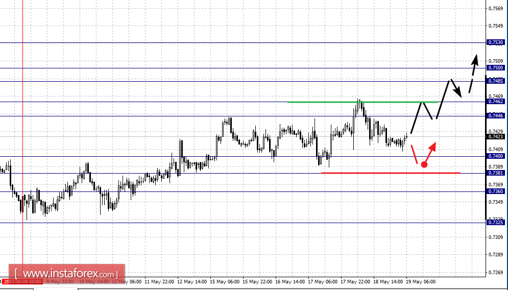 Краткосрочное нисходящее движение возможно в коридоре 0.7400 – 0.7381, пробой последнего значения приведет к углубленной коррекции, здесь цель – 0.7360, этот уровень является ключевой поддержкой для верха.