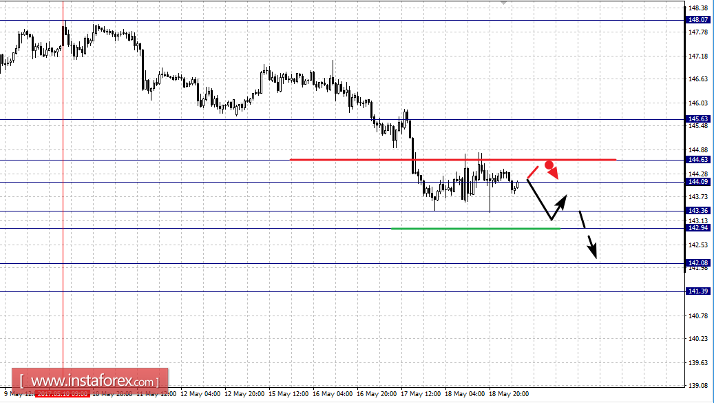 Краткосрочное восходящее движение возможно в коридоре 144.09 – 144.63, пробой последнего значения приведет к углубленной коррекции, здесь цель – 145.63, этот уровень является ключевой поддержкой для низа.