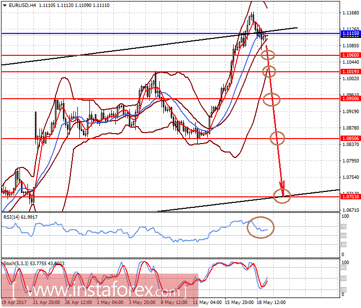 Пара GBPUSD находится выше уровня 1.2880, прорыв которого может стать причиной для снижения цены к 1.2770 и, возможно, затем к 1.2600. Но цена также может и «зависнуть» в ожидании итогов выборов в Парламент Великобритании, которые состоятся 8 июня. Если страсти в США вокруг Д. Трампа стихнут, то доллар обязательно получит поддержку на фоне ожидания повышения ставок в июне, и это будет важным поддерживающим доллар фактором.