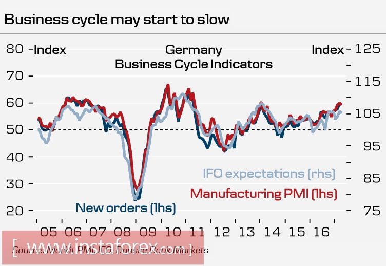 Ключевым днем для евро окажется вторник, рынку предстоит оценить, способна ли европейская валюта к продолжению ралли. В этот день выйдет индекс IFO для Германии, ожидания на данный момент неясные. С одной стороны, в США и Китае наблюдается рост рисков как политического, так и экономического свойства, с другой – заметное улучшение экономических показателей еврозоны и снижение политической напряженности после выборов во Франции. Также во вторник будут опубликованы предварительные данные PMI от Markit за май, причин ждать замедления деловой активности эксперты пока не видят.