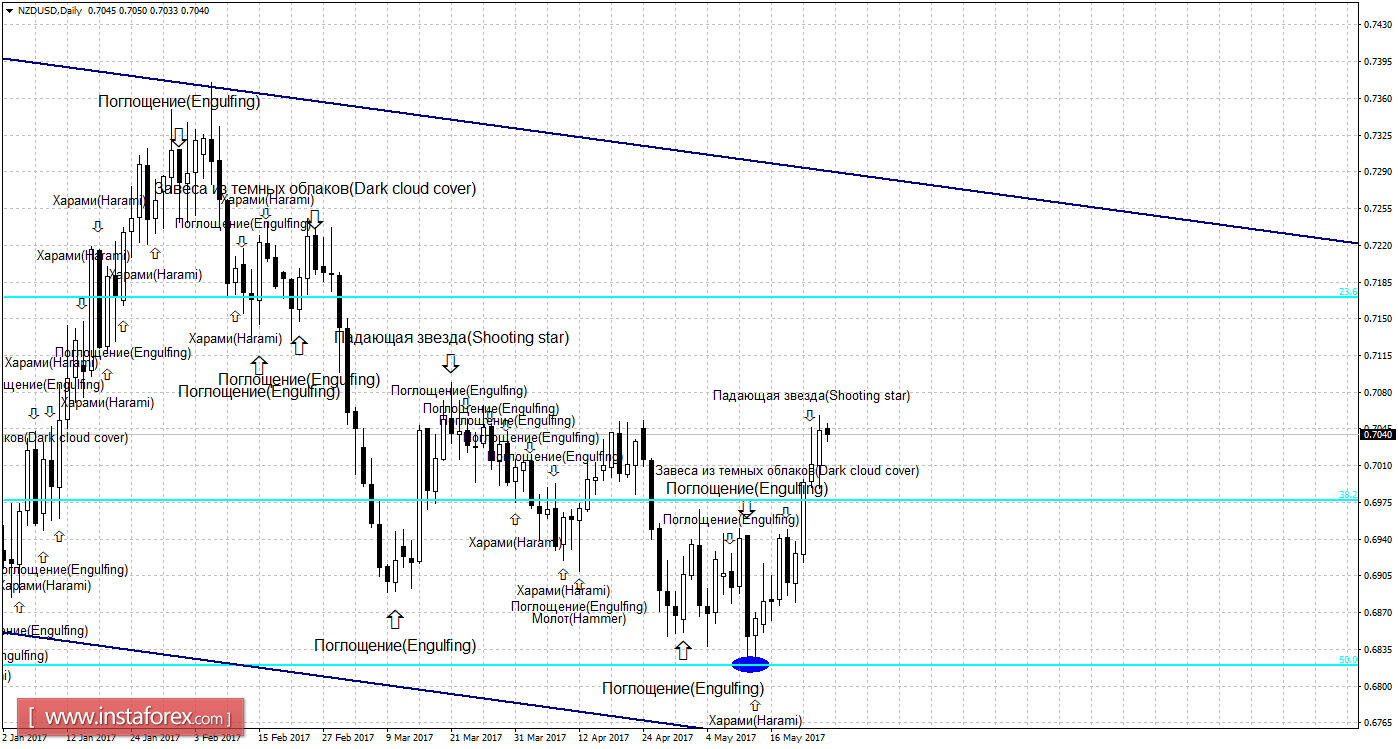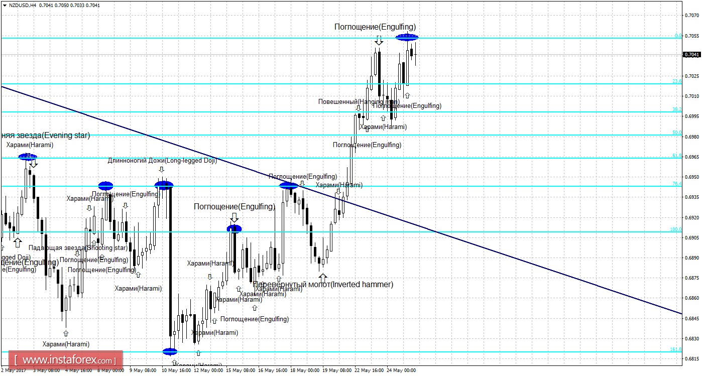 Рост пары на 4-часовом графике возобновился, и котировки отработали уровень коррекции 0,0% - 0,7053 после образования новой бычьей формации «Поглощение». Отбой курса пары от уровня Фибо 0,0% сработал в пользу американской валюты, началось небольшое падение в направлении коррекционного уровня 23,6% - 0,7019. Образование 25 мая бычьей формации позволит трейдерам рассчитывать на разворот в пользу валюты Новой Зеландии и возобновление роста котировок. Закрепление курса над уровнем Фибо 0,0% повысит шансы на продолжение роста, и будет построена новая сетка Фибо-уровней.