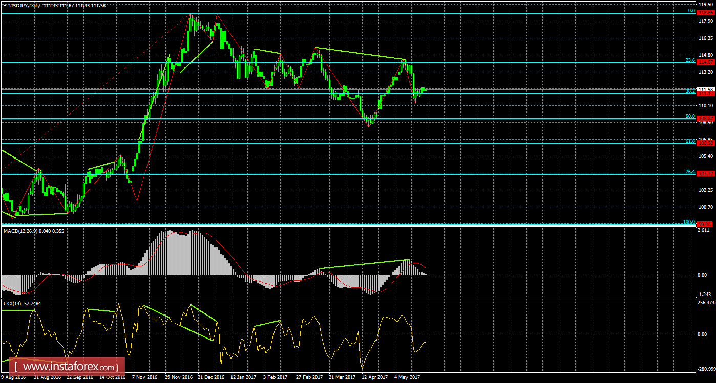 Котировки пары USD/JPY на 4-часовом графике выполнили разворот в пользу японской валюты и закрепление под уровнем Фибо 100,0% - 111,69. В итоге падение пары может быть продолжено 25 мая в направлении коррекционного уровня 161,8% - 109,32. Назревающих дивергенций сейчас не наблюдается ни у одного индикатора. Закрепление курса пары над уровнем коррекции 100,0% позволит трейдерам рассчитывать на разворот в пользу валюты Соединенных Штатов и некоторый рост в направлении коррекционного уровня 76,4% - 112,58.