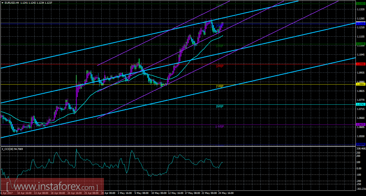 Курс евро/доллар на валютном рынке 25 мая еще один раз скорректировался и вновь возобновил восходящее движение. Старший канал направлен вверх, что свидетельствует о восходящем направлении движения глобального тренда. Младший канал также направлен наверх, что означает восходящее направление движения и в менее долгосрочном плане. На данный момент цена находится выше мувинга и выше уровня Мюррея «3/8». Поэтому целью для восходящего движения сейчас является уровень Мюррея «5/8» - 1,1353. В случае преодоления этого таргета, новой целью будет выступать уровень Мюррея «6/8» - 1,1475. Скользящая средняя направлена вверх, а цена находится выше нее, поэтому в ближайшее время актуально восходящее движение. Хайкен Аши окрасил последние бары в фиолетовый цвет, что говорит нам о внутридневном восходящем движении, таким образом, до разворота индикатора вниз, что будет означать новый виток коррекции, открытые лонги можно поддерживать. Короткие позиции станут актуальными только после разворота вниз любого канала и закрепления цены ниже мувинга. Индикатор CCI находится около уровня 100, что говорит о наличие слабой перепроданности валютной пары.