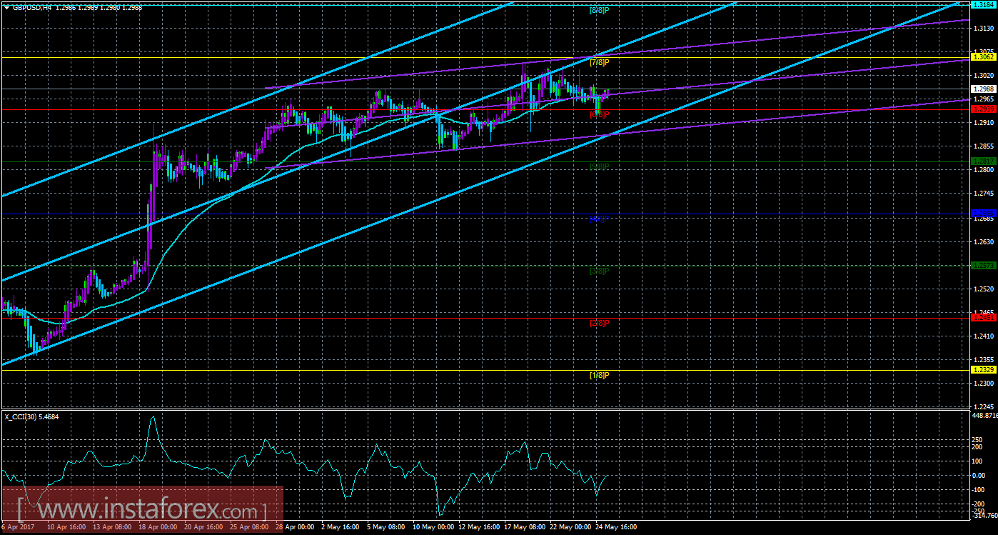 Курс фунта стерлингов 25 мая ненадолго закрепился ниже скользящей средней линии, но почти сразу вернулся в область выше этой линии. Старший канал направлен наверх, что свидетельствует о восходящем направлении глобального тренда. Младший канал также направлен наверх, что означает восходящее направление движения и в менее долгосрочном плане. Цена сейчас находится выше уровня Мюррея «6/8», а также выше скользящей средней, что говорит в пользу восходящей тенденции. Текущей целью восходящего движения остается уровень Мюррея «7/8» - 1,3062. Если этот таргет будет преодолен, то новой актуальной целью будет выступать уровень Мюррея «8/8» - 1,3184. Индикатор Хайкен Аши окрасил последние бары в фиолетовый цвет, что свидетельствует о локальном восходящем движении, разворот индикатора вниз укажет на очередной виток коррекционного движения, а лонги вновь станут не доступными для открытия. Скользящая средняя линия направлена вбок, а цена в свою очередь находится выше нее, поэтому сейчас более актуальна восходящая тенденция. Ордера на продажу можно будет рассматривать только после разворота вниз любого канала линейной регрессии и закрепления ниже скользящей средней линии. Индикатор CCI находится около уровня 0, что обозначает отсутствие любой перекупленности и перепроданности валютной пары.