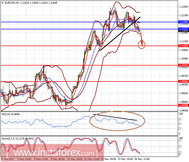 Пара EURUSD торгуется ниже уровня 1.1170, реализуя технический сигнал дивергенция. Продолжение этой тенденции на волне ожидания роста ставок Федрезервом на июньском заседании будет оказывать давление на пару. Учитывая это, мы считаем необходимым ее продавать с локальной целью 1.1100-10.