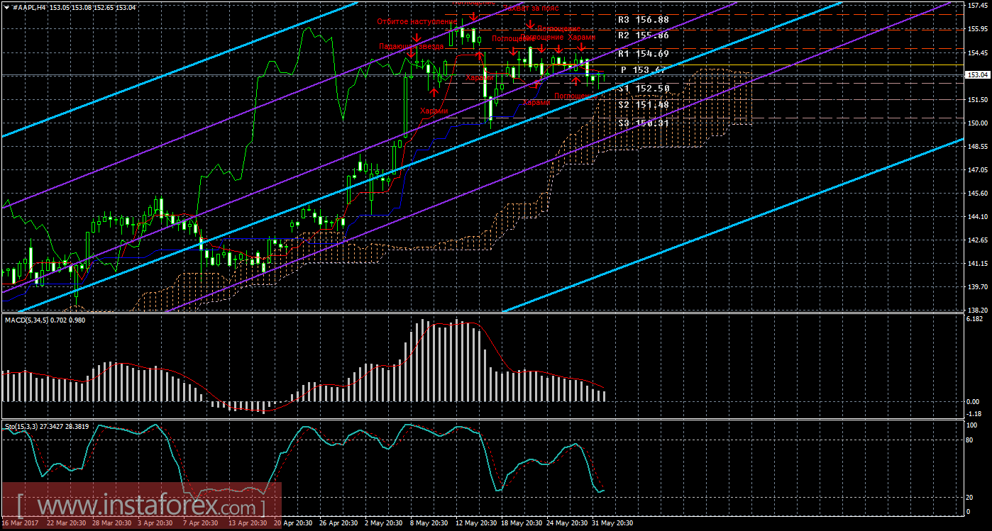 Анализируя акции компании Apple 2 июня, видно, что цена преодолела критическую линию Киджун-сен, коррекция, таким образом, продолжается. Текущий «золотой крест» остается сильным (так как цена располагается выше облака), поэтому лонги индикатор Ишимоку разрешает рассматривать. Оба канала линейной регрессии направлены вверх, поэтому длинные позиции актуальны и по этому признаку. Целью для восходящего движения инструмента является сейчас первый уровень сопротивления 154,69, но рассматривать длинные позиции можно будет только выше Киджун-сен. В случае преодоления этого таргета, целью будет выступать уровень сопротивления 155,86. Сформировалась новая медвежья модель «Харами», которая просигнализировала о продолжении нисходящей коррекции. MACD по-прежнему направлен вниз, сигнализируя о нисходящем движении, если индикатор развернется обратно наверх, это просигнализирует о возможном возобновлении восходящего тренда. Стохастик покинул область перекупленности, что сейчас свидетельствует о неопределенном настроении участников рынка. На младшем графике видно, что цена продолжает располагаться ниже линии Киджун-сен, а последний нижний фрактал обновлен, что говорит сейчас в пользу продолжения коррекционного движения. Таким образом, ордера на покупку с целью уровень сопротивления 154,69 можно рассматривать, но только после закрепления цены выше линии Тенкан-сен.