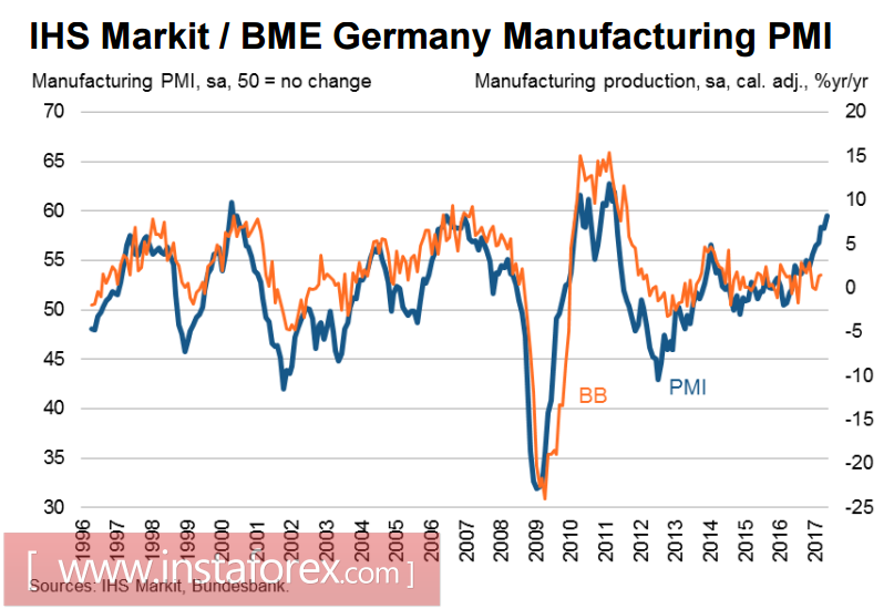 Производственный сектор в Германии расширяется самыми быстрыми темпами за последние 6 лет. Как следует из опубликованного в четверг отчета Markit, PMI вырос до 73-месячного максимума, растут объёмы новых заказов и темпы создания новых рабочих мест, рост экспорта максимальный за 7 лет.