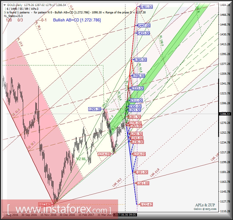 Развитие движения цены инструмента (Gold Spot)в июне-июле 2017 г. будет обусловлено отработкой границ канала 1/2 Median Line (1270.00 <-> 1281.50 <-> 1293.50) и зоны равновесия (1281.50 <-> 1300.00 <-> 1311.00) вил операционного масштаба Minute, которые расположены внутри канала 1/2 Median Line (1265.00 <-> 1300.00 <-> 1333.00) вил операционного масштаба Minor.