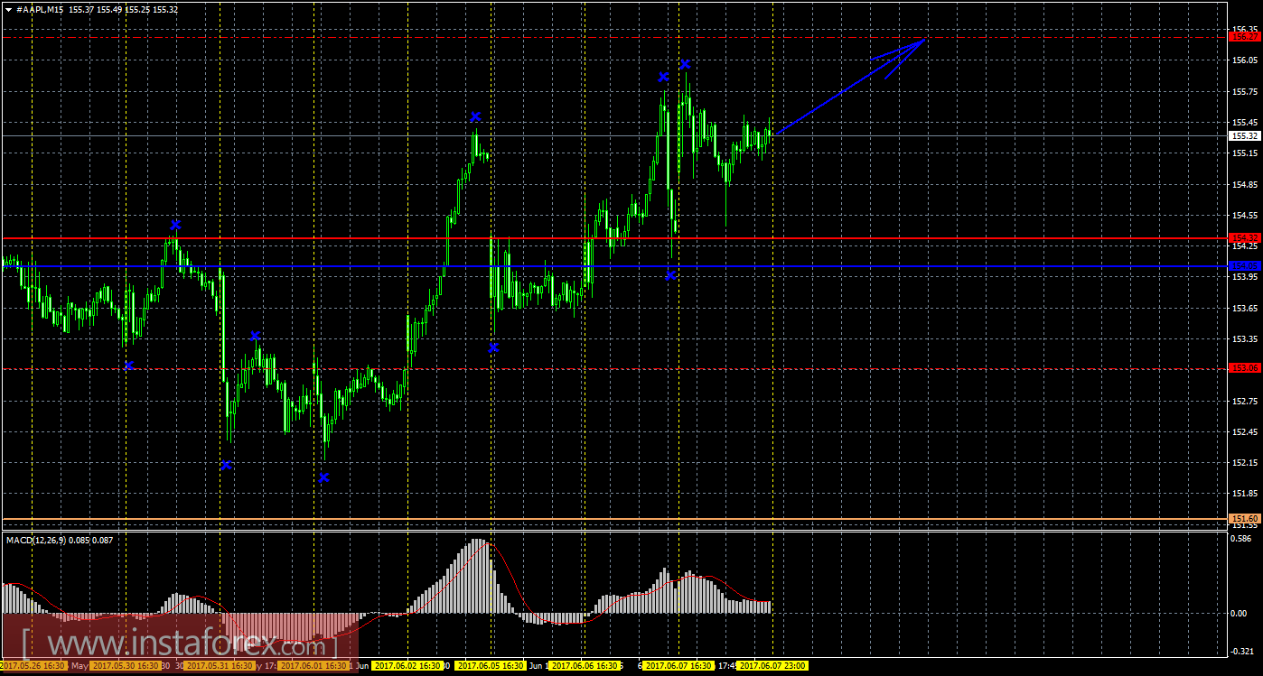 Цена акций Apple может продолжить движение вверх. На текущем графике сейчас рекомендуется рассматривать длинные позиции с целью 156,27 и второй целью 157,43. Закрывать вручную ордера на покупку рекомендуется при отскоке цены от уровня 156,27, в случае разворота индикатора MACD вниз или при образовании медвежьей модели (с подтверждением). Стоп-лосс при торговле на повышение выставляем ниже критической линии 154,05. Короткие позиции сейчас не актуальны.