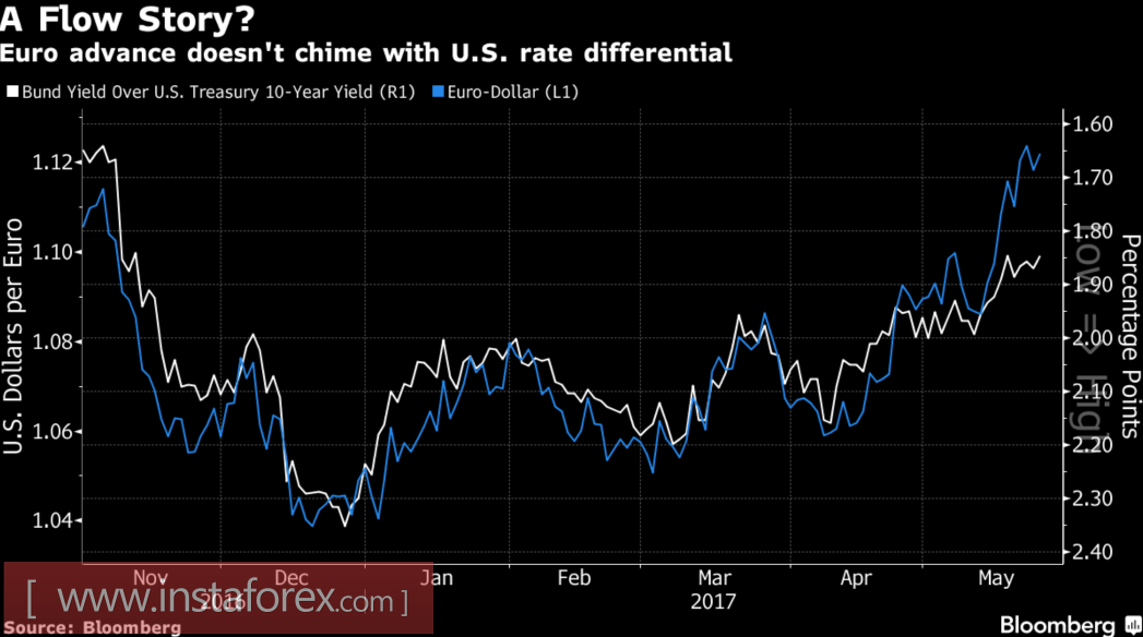 На мой взгляд, очевидно лишь одно. ЕЦБ придется нормализовать денежно-кредитную политику. Но не сейчас. И вряд ли до сентября. В связи с этим риски коррекции EUR/USD в ближайшее время будут возрастать. Так, Deutsche bank считает, что евро не сможет выйти за пределы диапазона $1,05-1,15, при этом переоценка региональной валюты с точки зрения дифференциала доходности американских и немецких облигаций, а также отток капитал из ETF, ориентированных на европейские акции, заложат фундамент для краткосрочного отката. Действительно, судя по спреду ставок долгового рынка, пара EUR/USD должна находиться вблизи отметки 1,1, хотя на самом деле облюбовала себе теплое местечко повыше.