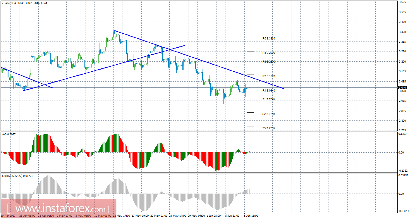 Анализ природного газа за 9 июня показывает, что цена начала новый виток коррекции и закрепилась выше уровня R1. На данный момент актуально нисходящее движение с целями уровни поддержки S1 – 2,9740 и S2 – 2,8760, если цена закрепится ниже 3,0340. Целью для продолжения восходящей коррекции выступает уровень 3,1320, если цена останется выше 3,0340. Новая нисходящая линия тренда поддерживает сейчас торгующих на понижение и делает актуальными ордера на продажу. Если цена закрепится выше нее, это укажет на смену тенденции на рынке и станут актуальными длинные позиции. Индикатор Awesome показывает локальное восходящее движение, последний закрытый бар окрашен в зеленый цвет. OsMA также направлен вверх, что сигнализирует о восходящем движении цены на газ и в среднесрочной перспективе. Отскок от линии тренда может спровоцировать возобновление нисходящего движения.