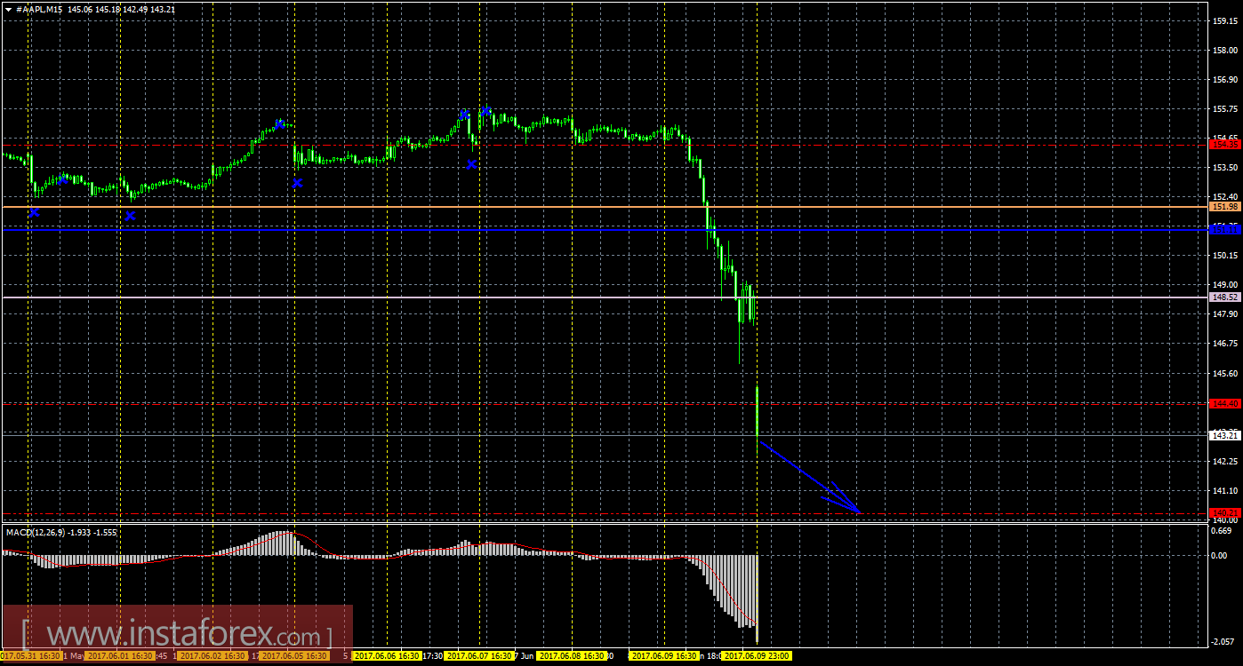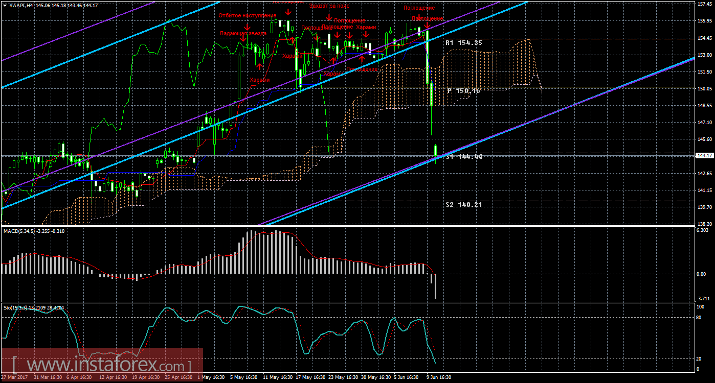Анализируя акции компании Apple 12 июня, видно, что цена резко начала сильное движение вниз и уже отработала первый таргет на этой неделе. Текущий «мертвый крест» является сильным (так как цена располагается ниже облака), поэтому шорты индикатор Ишимоку делает доступными для открытия. Оба канала линейной регрессии направлены вверх, поэтому короткие позиции не актуальны по этому признаку. Целью для нисходящего движения инструмента является сейчас первый уровень поддержки 144,40, который уже отработан. В случае преодоления этого таргета, целью будет выступать уровень поддержки 140,21. Сформировалась новая медвежья модель «Поглощение», которая указала на начало нисходящего движения. MACD развернулся вниз, сигнализируя о нисходящем движении, если индикатор развернется наверх, это просигнализирует о витке коррекционного движения. Стохастик по-прежнему находится между двум областям, перекупленности и перепроданности, что по-прежнему свидетельствует о неопределенном настроении участников рынка. Отскок цены от первого таргета может спровоцировать восходящую коррекцию. На младшем графике видно, что цена теперь располагается ниже всех линий Ишимоку и отработала первый таргет 144,40. Если цена преодолеет его, то короткие позиции будет актуальными с целью уровень 140,21. Индикатор MACD может начать разряжаться в ближайшее время.