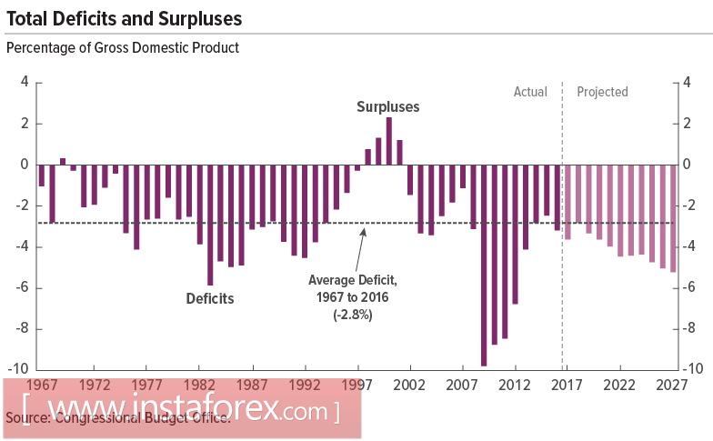 Бюджетный комитет Конгресса (CBO) обновил прогнозы по основным ключевым параметрам экономики США. Рост ВВП прогнозируется на уровне 1.9%, этот параметр остался без изменений, а вот прогноз по бюджету на 2017 г. ухудшен с 3.2% до 3.6%. Ожидается, что до 2027 дефицит вырастет до 5.2% при условии, что законодательство останется неизменным. Ухудшение январской оценки произошло главным образом из-за того, что налоговые сборы оказались слабее, чем ожидалось.